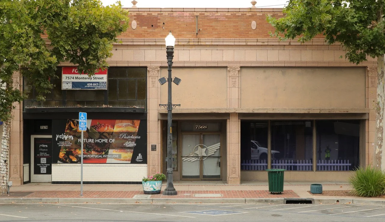 This two-story brick front commercial building was built by Gilroy’s most prolific builder, William Radtke in 1928. It started life as the Red and White Gilroy Food Shop and has seen a wide variety of uses since then. The terra cotta ornamentation embellishing the roofline with free-standing urns is the most distinctive feature. The embossed pilasters which frame the large windows are especially handsome. The unit next door at 7574 Monterey Street was originally part of the same building, but has an altered façade. The segmented windows above its entrance were probably originally part of 7568 also.